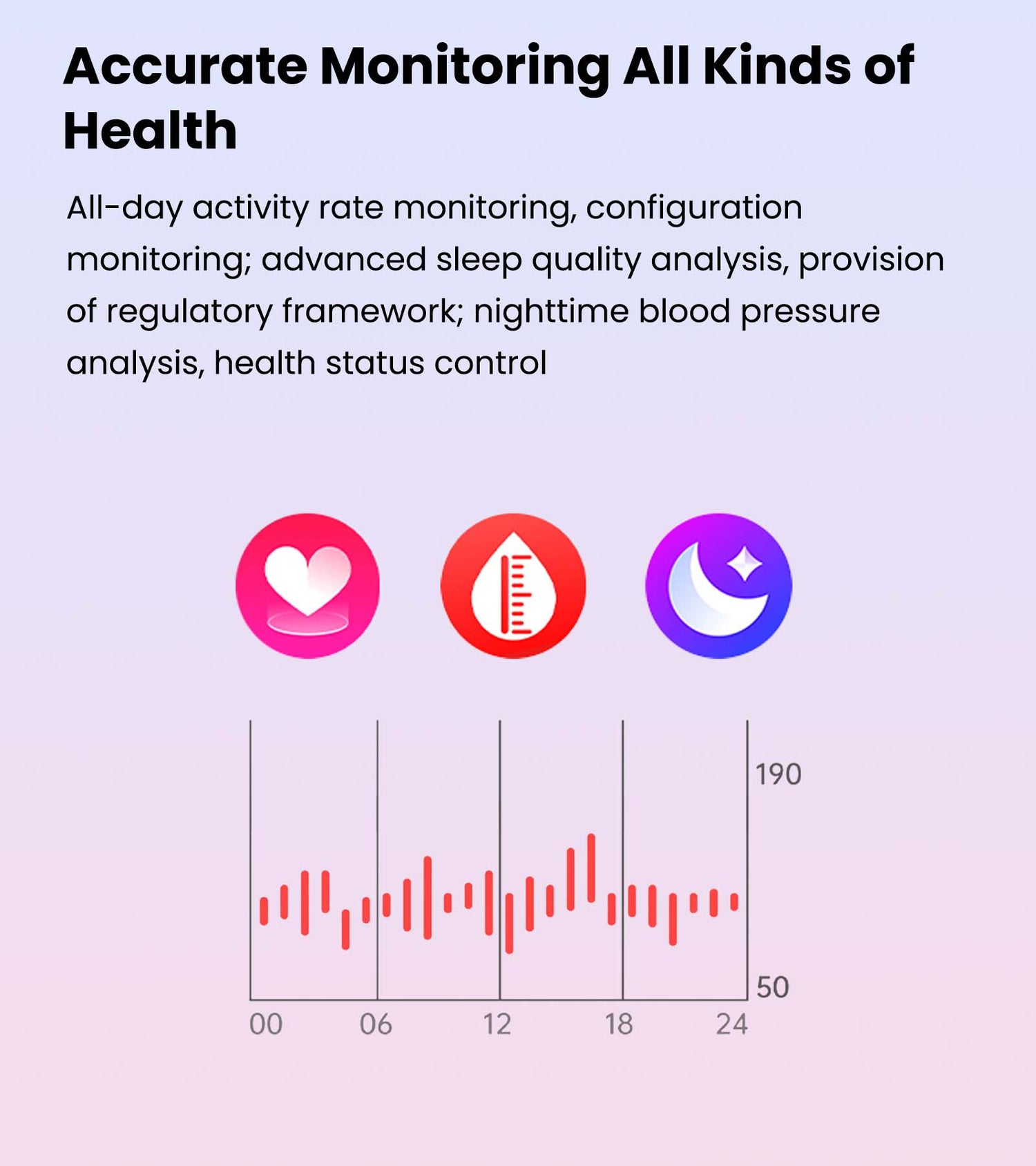 Blood pressure, heart rate, blood oxygen, sedentary reminder, sleep monitoring, automatic heart rate monitoring, etc.