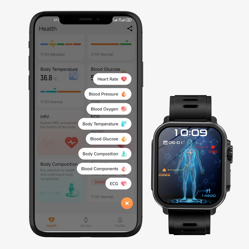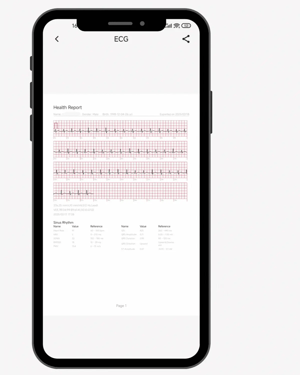 - ECG Function: Instant 60-second ECG test on the wrist, with immediate evaluation and analysis of the health significance of the current ECG. The ECG test can also be initiated through the app, with a detailed analysis of the health significance of the recorded ECG. Download and share the ECG report.